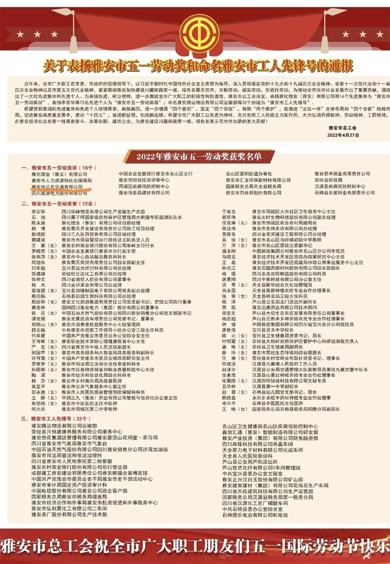 4月28日,市總工會召開2022年雅安市慶祝“五一”國際勞動節(jié)暨表揚大會,交建集團(tuán)雅安市公共交通有限公司榮獲全市五一勞動獎狀殊榮。