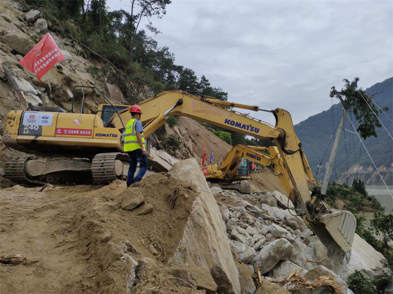 搶險(xiǎn)隊(duì)伍,馬上出發(fā)!集團(tuán)領(lǐng)導(dǎo)班子立即召開碰頭會(huì),分析研判形勢,安排部署工作,密切關(guān)注震區(qū)態(tài)勢,成立抗震救災(zāi)領(lǐng)導(dǎo)小組,副總經(jīng)理鐘焱宇率現(xiàn)場指揮組趕赴石棉靠前指揮搶險(xiǎn)救災(zāi)。正在石棉G108線施工的康藏路橋公司項(xiàng)目部組成10人搶險(xiǎn)救援小分隊(duì),攜帶挖掘機(jī)4臺(tái)、拖車4臺(tái)、裝載機(jī)3臺(tái)、交通運(yùn)輸車2輛、無人機(jī)1臺(tái),第一時(shí)間到就地?fù)岆U(xiǎn)工作,震后7小時(shí),完成國道G108線馬富至菩薩崗約40公里路段、6處塌方點(diǎn)1600余方土石方清理,爾后轉(zhuǎn)戰(zhàn)石棉縣新民鄉(xiāng)進(jìn)行通鄉(xiāng)道路搶通作業(yè)。
