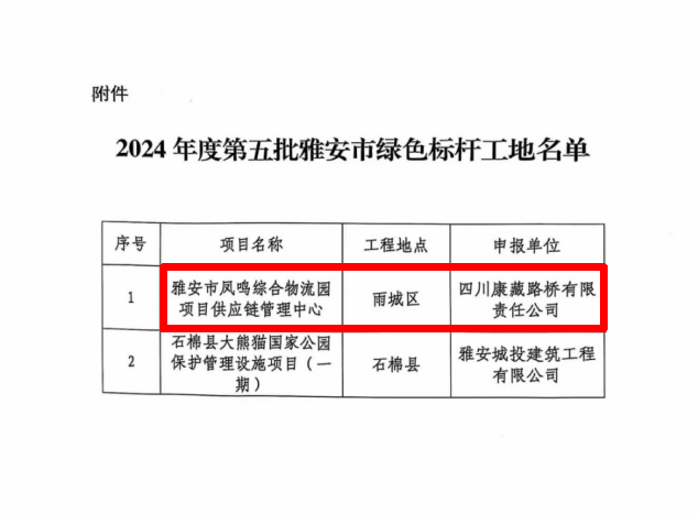 近日,由雅安交建集團(tuán)康藏路橋公司建設(shè)的鳳鳴綜合物流園項(xiàng)目供應(yīng)鏈管理中心,經(jīng)市住建局、市生態(tài)環(huán)境局、市城管執(zhí)法局聯(lián)合評審小組綜合考評,被評為雅安市綠色標(biāo)桿工地。