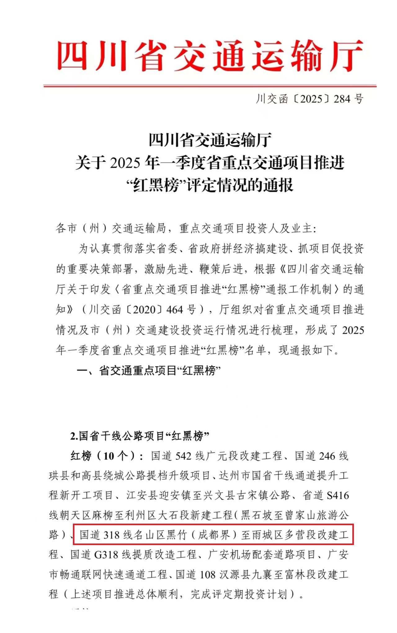 近日,四川省交通運(yùn)輸廳發(fā)布2025年一季度省重點(diǎn)交通項(xiàng)目推進(jìn)“紅黑榜”評(píng)選結(jié)果,由雅安交建集團(tuán)四川康藏路橋有限責(zé)任公司承建的國道318線名山區(qū)黑竹(成都界)至雨城區(qū)多營段改建工程憑借超額完成投資計(jì)劃、關(guān)鍵節(jié)點(diǎn)取得突破等成效,成功入選國省干線公路項(xiàng)目“紅榜”。