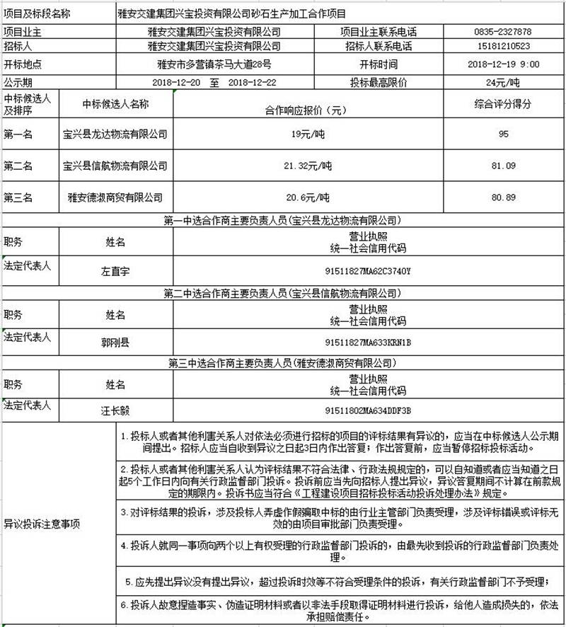雅安交建集團興寶投資有限公司砂石生產(chǎn)加工合作項目征集合作方公示