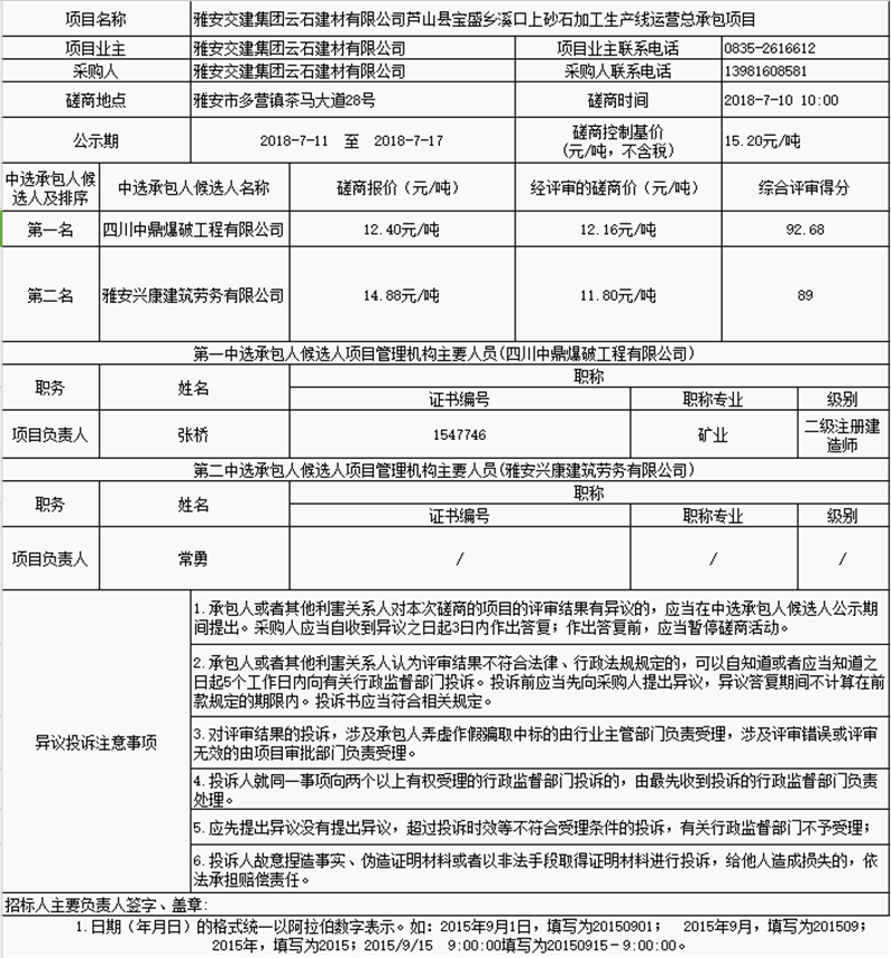 雅安交建集團(tuán)云石建材有限公司蘆山縣寶盛鄉(xiāng)溪口上砂石加工生產(chǎn)線運(yùn)營(yíng)總承包項(xiàng)目中選承包人公示