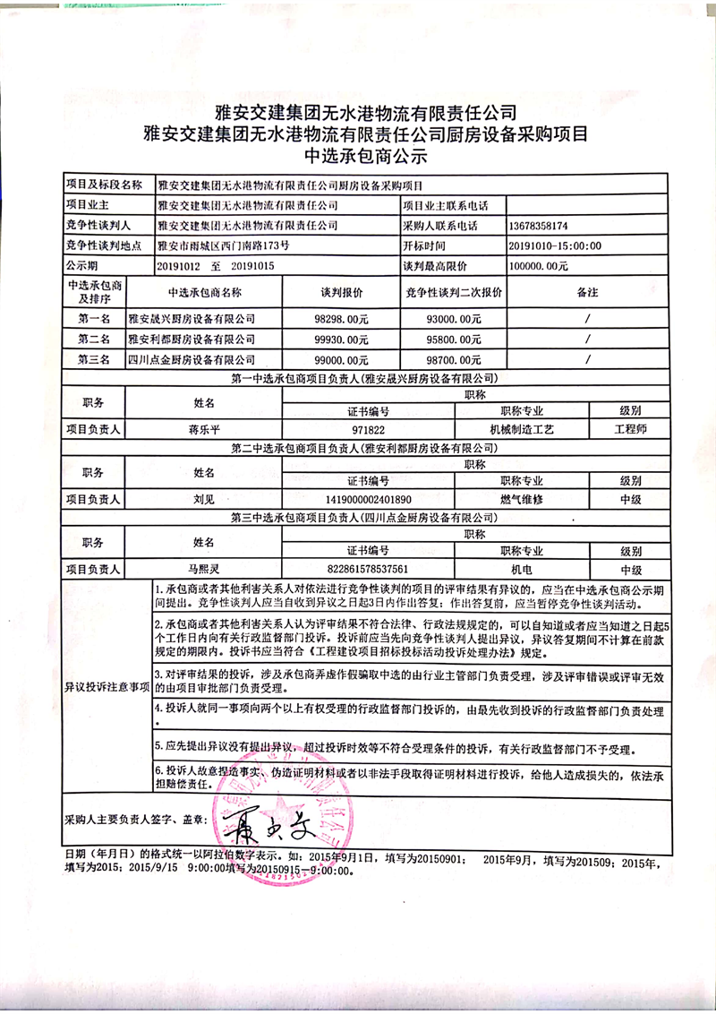 雅安交建集團無水港物流有限責(zé)任公司廚房設(shè)備采購項目中選承包商公示