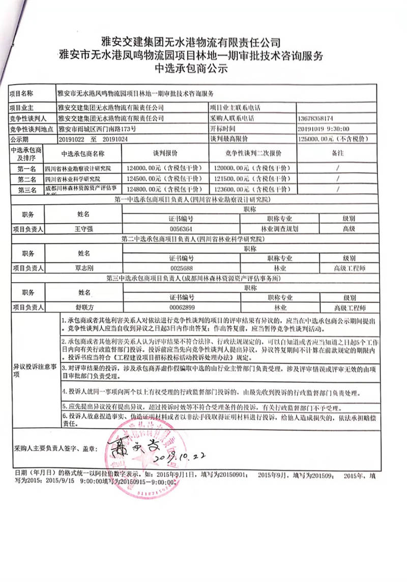 雅安交建集團無水港物流有限責(zé)任公司雅安市無水港鳳鳴物流園項目林地一期審批技術(shù)咨詢服務(wù)中選承包商公示