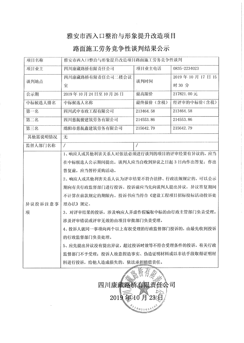 四川康藏路橋有限責(zé)任公司雅安市西入口整治與形象提升改造項目路面施工勞務(wù)競爭性談判結(jié)果公示