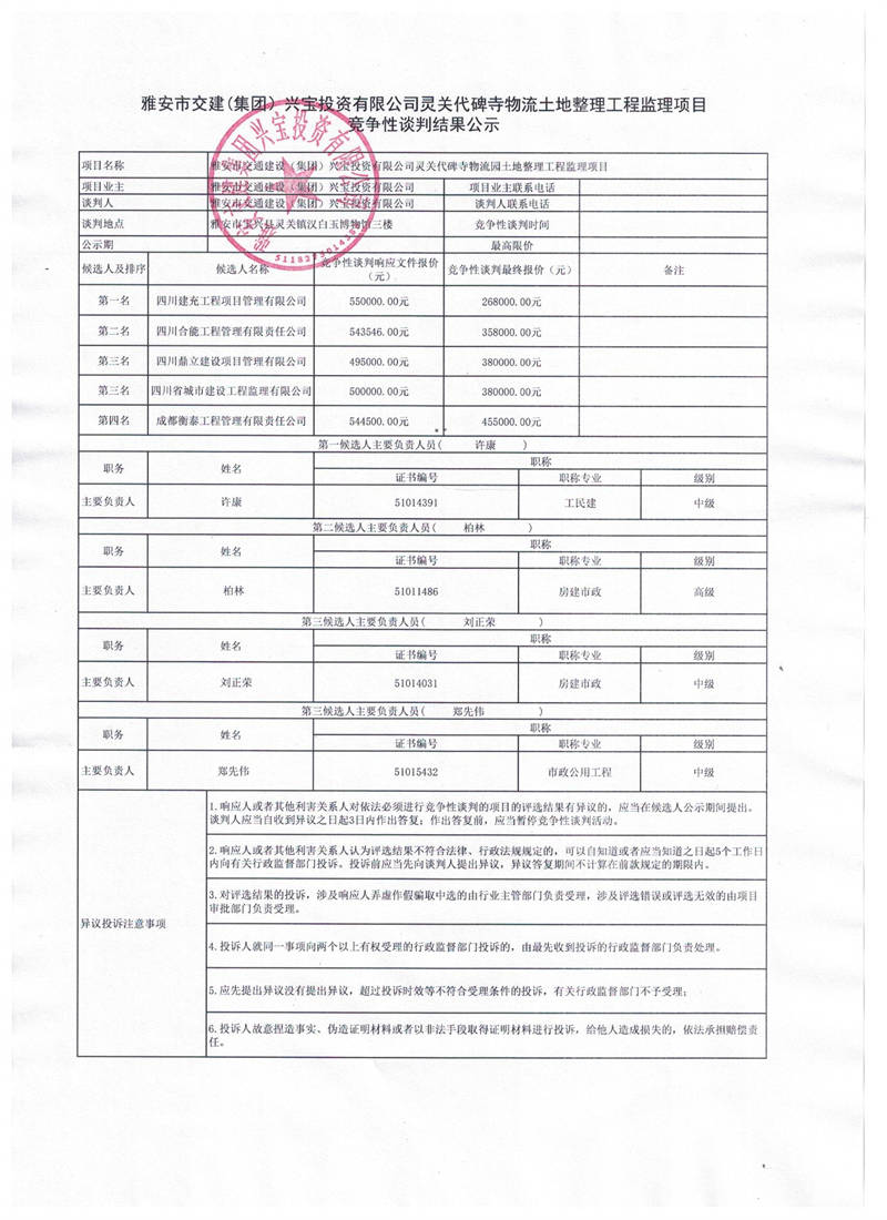 雅安交建集團興寶投資有限公司寶興縣靈關代碑寺物流園土地整理工程監(jiān)理項目競爭性談判結(jié)果公示