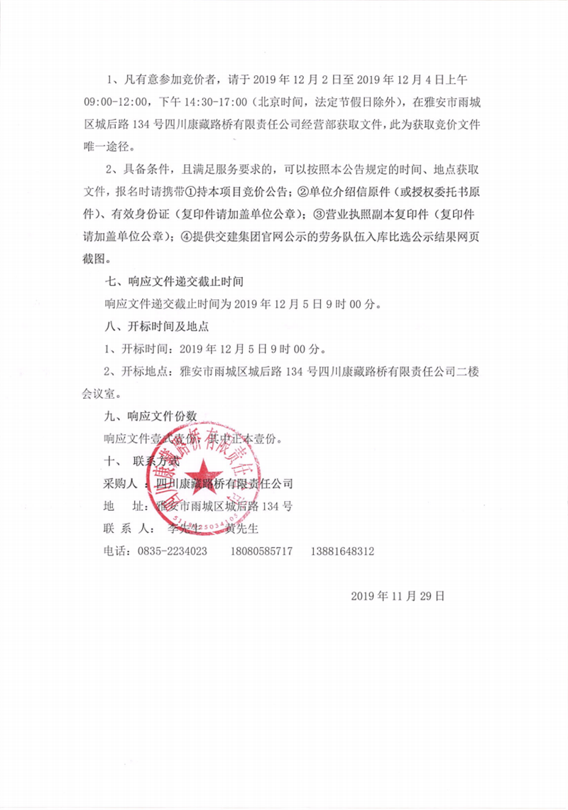 四川康藏路橋有限責任公司蘆山縣龍門、大川等8個鄉(xiāng)鎮(zhèn)基礎設施恢復提升工程項目施工勞務(2標段)第二次競價公告
