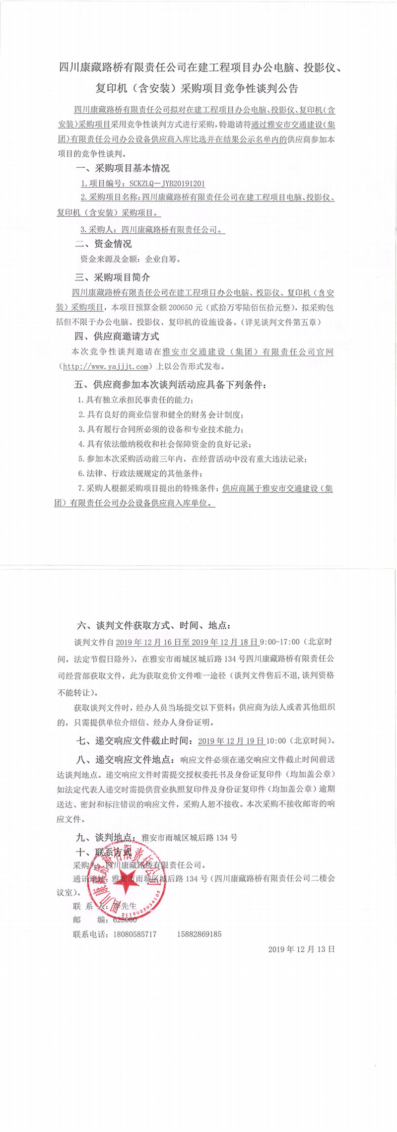 四川康藏路橋有限責(zé)任公司在建工程項(xiàng)目辦公電腦、投影儀、復(fù)印機(jī)(含安裝)采購項(xiàng)目競爭性談判公告
