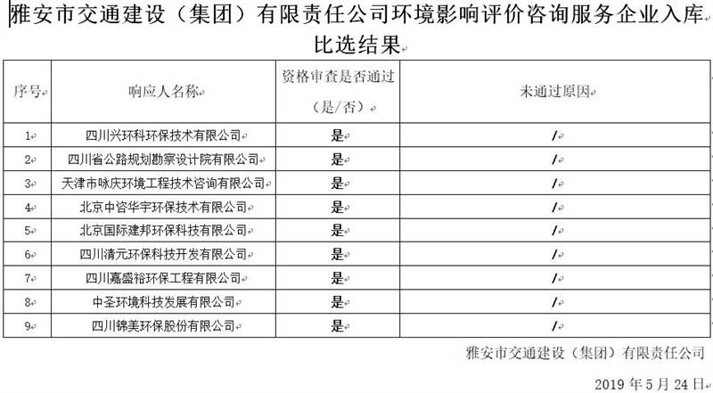雅安市交通建設(shè)(集團(tuán))有限責(zé)任公司環(huán)境影響評價(jià)咨詢服務(wù)企業(yè)入庫比選結(jié)果公示