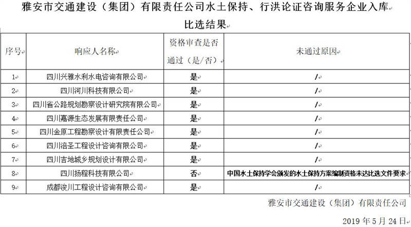 雅安市交通建設(shè)(集團(tuán))有限責(zé)任公司水土保持、行洪論證咨詢(xún)服務(wù)企業(yè)入庫(kù)比選結(jié)果公示