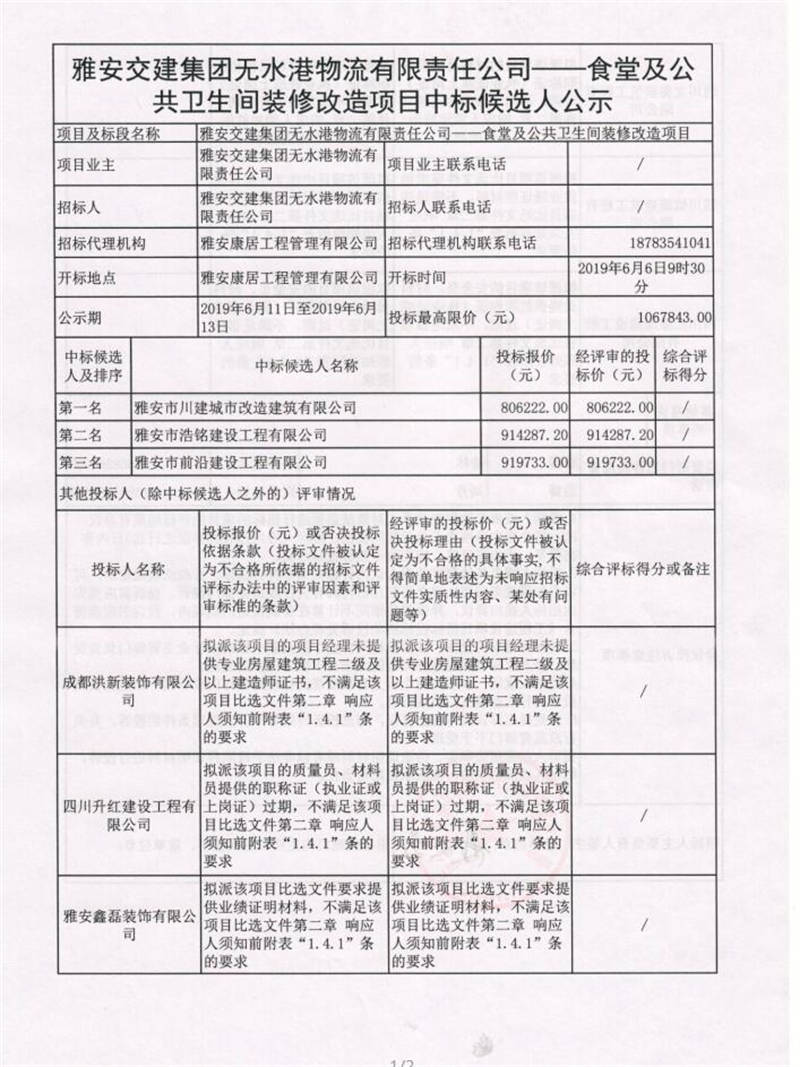雅安交建集團無水港物流有限公司食堂及公共衛(wèi)生間裝修改造項目中標(biāo)候選人公示