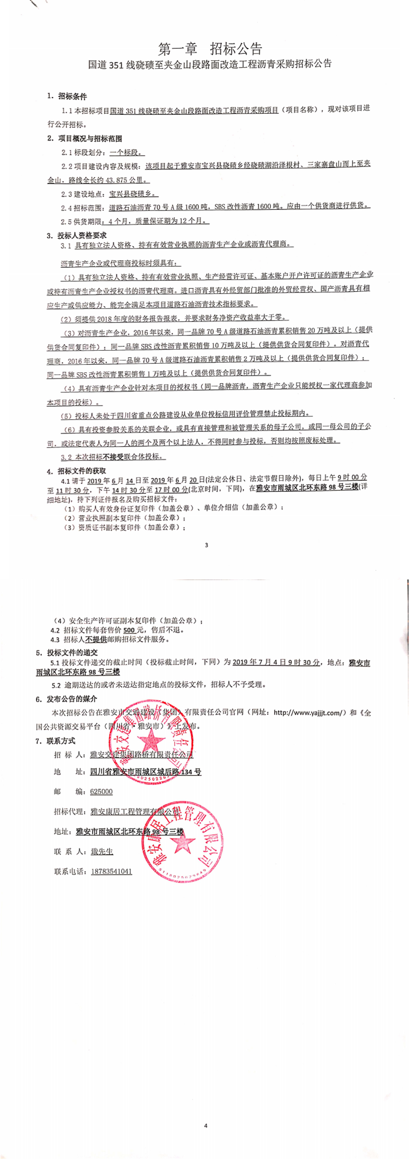 雅安交建集團路橋有限責任公司國道351線磽磧至夾金山段路面改造工程瀝青采購招標公告