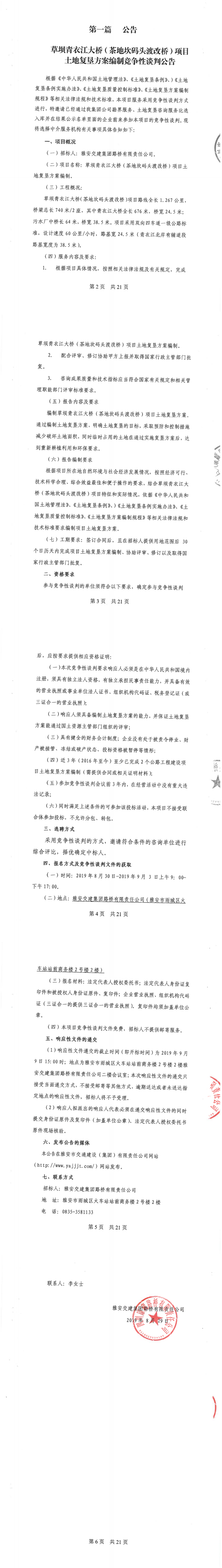 雅安交建集團(tuán)路橋有限責(zé)任公司草壩青衣江大橋(茶地坎碼頭渡改橋)土地復(fù)墾方案編制競(jìng)爭(zhēng)性談判公告