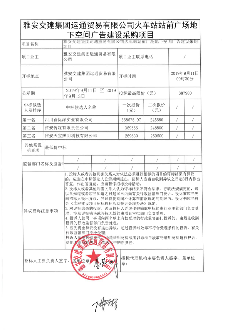 雅安交建集團(tuán)運(yùn)通貿(mào)易有限公司火車站站前廣場地下空間廣告建設(shè)采購項目結(jié)果公示