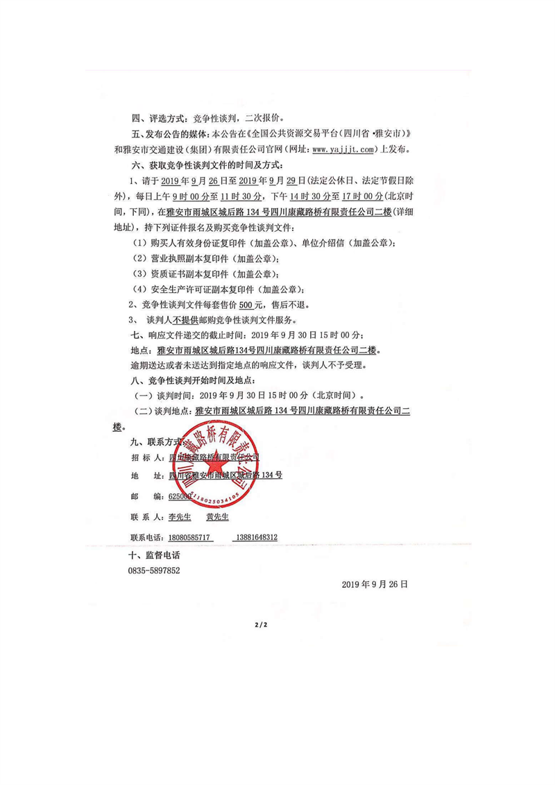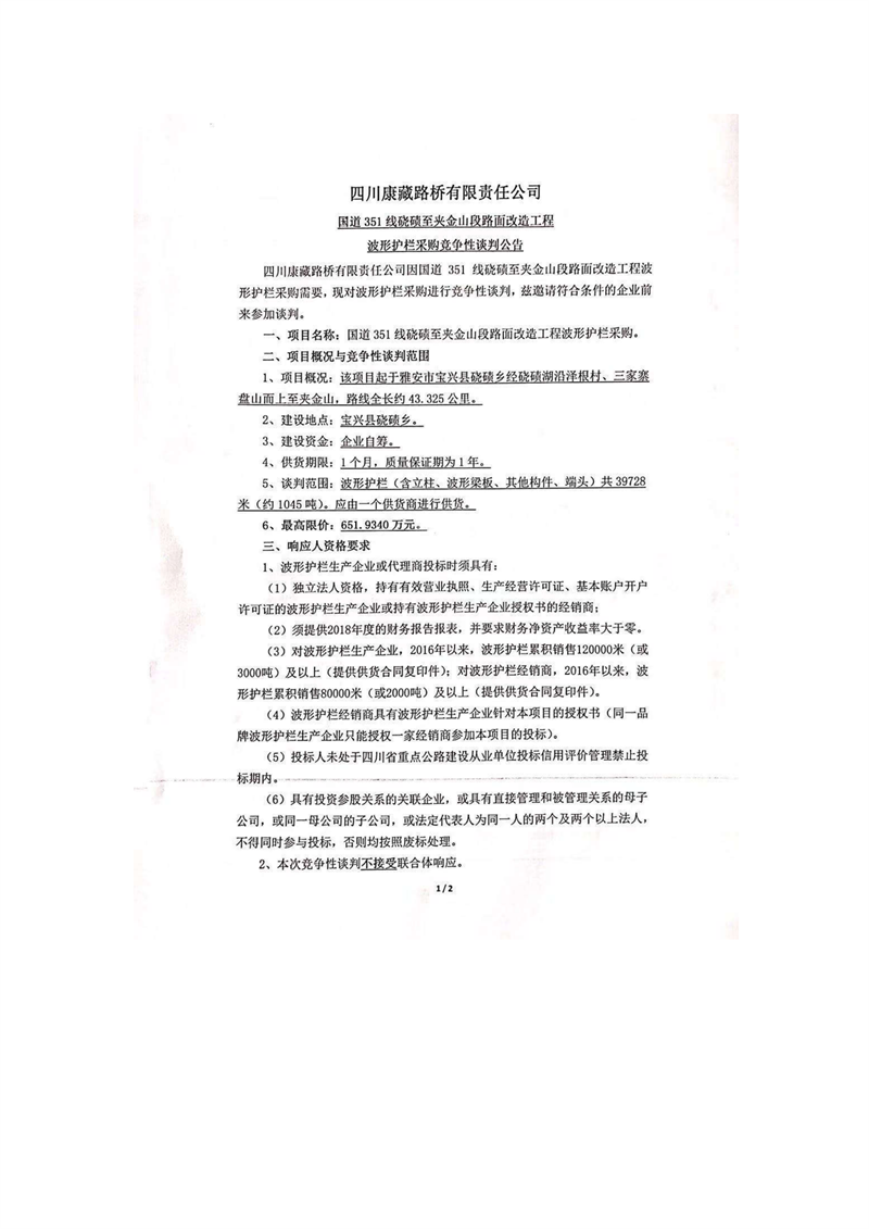 四川康藏路橋有限責(zé)任公司國道351線磽磧至夾金山段路面改造工程波形護(hù)欄采購競爭性談判公告