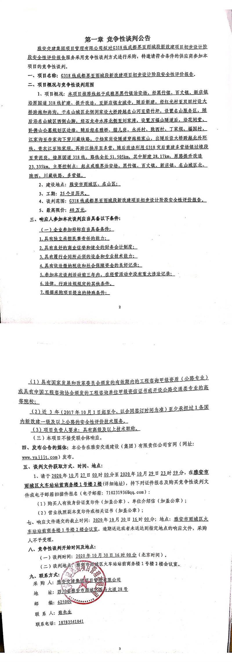 雅安交建集團項目管理有限公司G318線成都界至雨城段新改建項目初步設(shè)計階段安全性評價報告競爭性談判公告