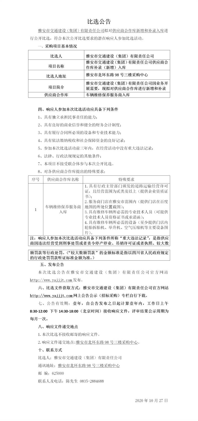 雅安市交通建設(集團)有限責任公司供應商合作庫補錄(新增)入庫比選公告