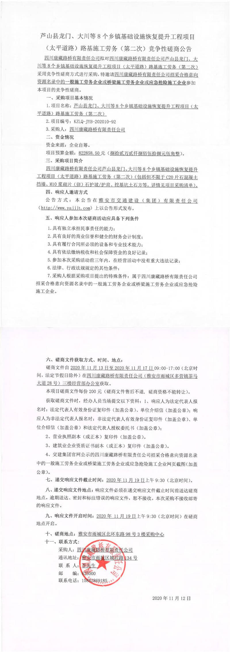 四川康藏路橋有限責(zé)任公司蘆山縣龍門、大川等8個(gè)鄉(xiāng)鎮(zhèn)基礎(chǔ)設(shè)施恢復(fù)提升工程項(xiàng)目(太平道路)路基施工勞務(wù)(第二次)競(jìng)爭(zhēng)性磋商公告