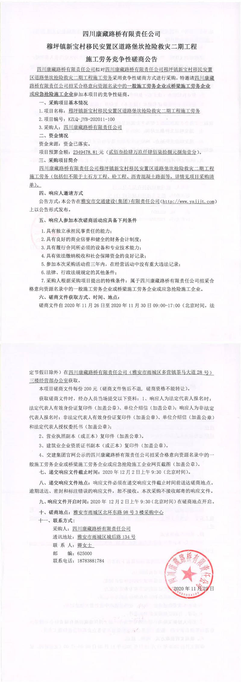 四川康藏路橋有限責任公司穆坪鎮(zhèn)新寶村移民安置區(qū)道路堡坎搶險救災二期工程施工勞務競爭性磋商公告