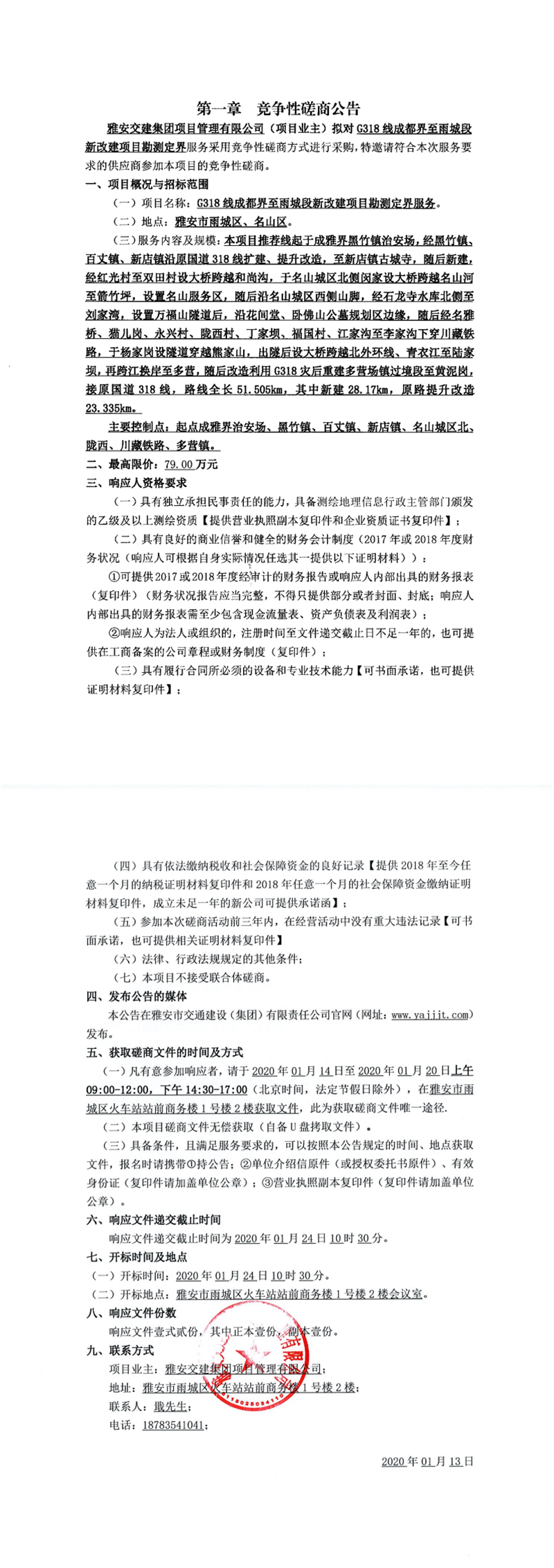 雅安交建集團(tuán)項(xiàng)目管理有限公司G318線成都界至雨城段新改建項(xiàng)目勘測(cè)定界服務(wù)競(jìng)爭性磋商公告
