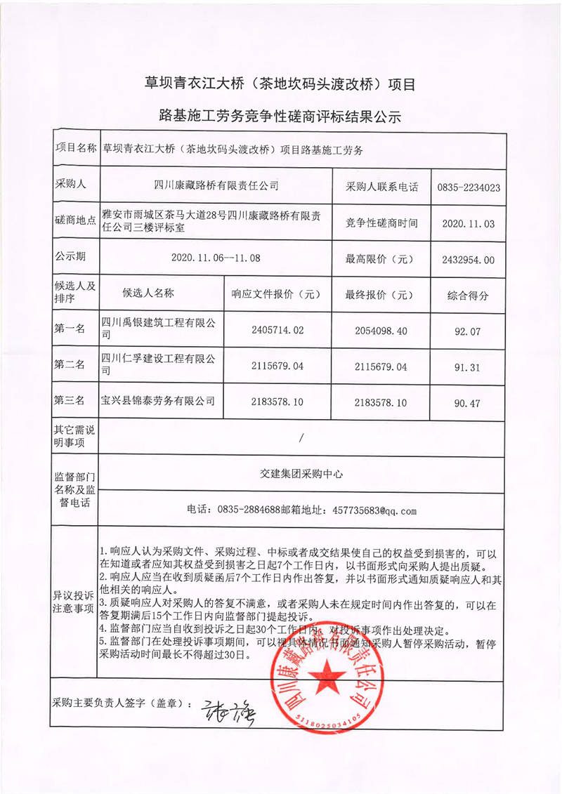 四川康藏路橋有限責(zé)任公司草壩青衣江大橋(茶地坎碼頭渡改橋)項目路基施工勞務(wù)競爭性磋商評標(biāo)結(jié)果公示