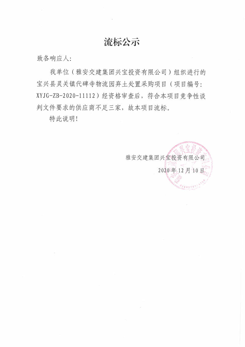 雅安交建集團興寶投資有限公司寶興縣靈關鎮(zhèn)代碑寺物流園棄土處置采購項目流標公示