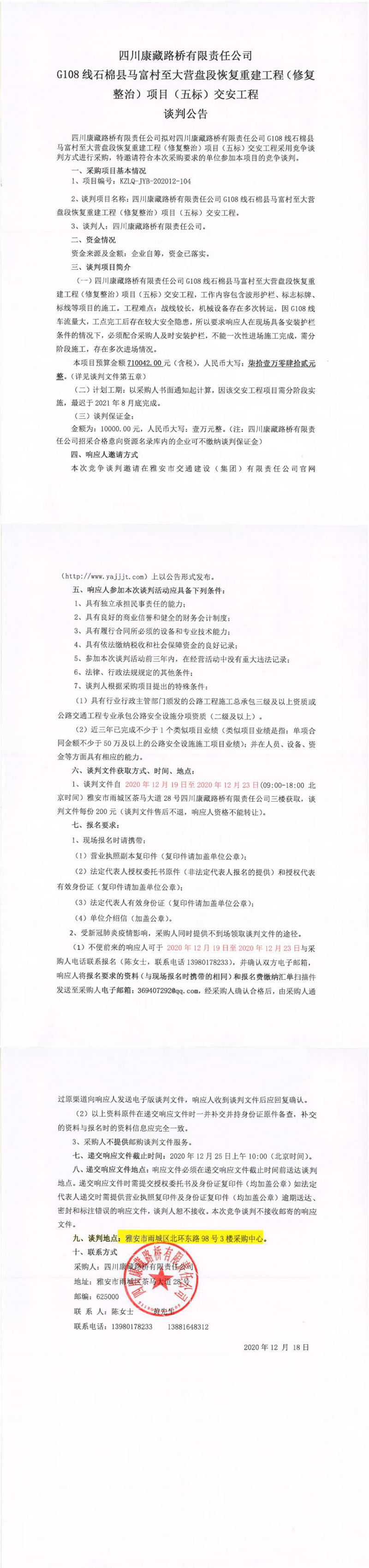 四川康藏路橋有限責(zé)任公司G108線石棉縣馬富村至大營盤段恢復(fù)重建工程(修復(fù)整治)項目(五標(biāo))交安工程談判公告