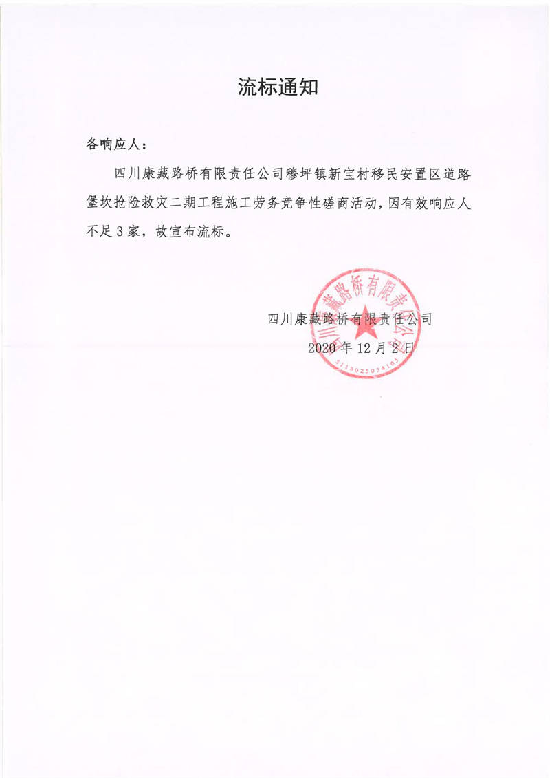 四川康藏路橋有限責任公司穆坪鎮(zhèn)新寶村移民安置區(qū)道路堡坎搶險救災二期工程施工勞務(wù)流標通知