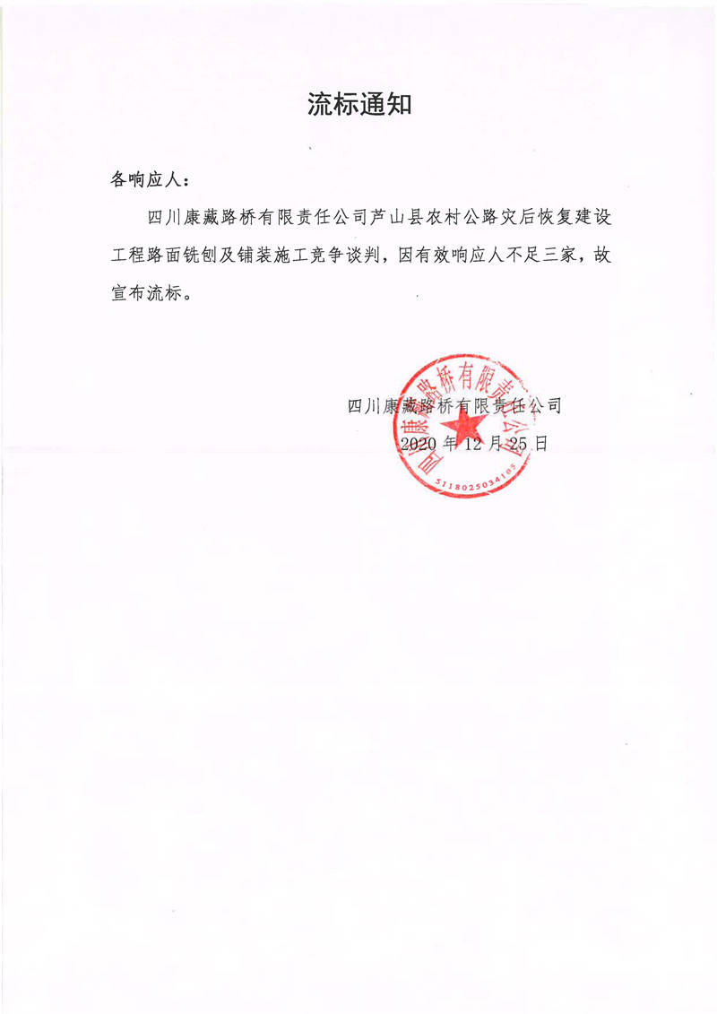 四川康藏路橋有限責任公司蘆山縣農(nóng)村公路災(zāi)后恢復建設(shè)工程路面銑刨及鋪裝施工流標通知