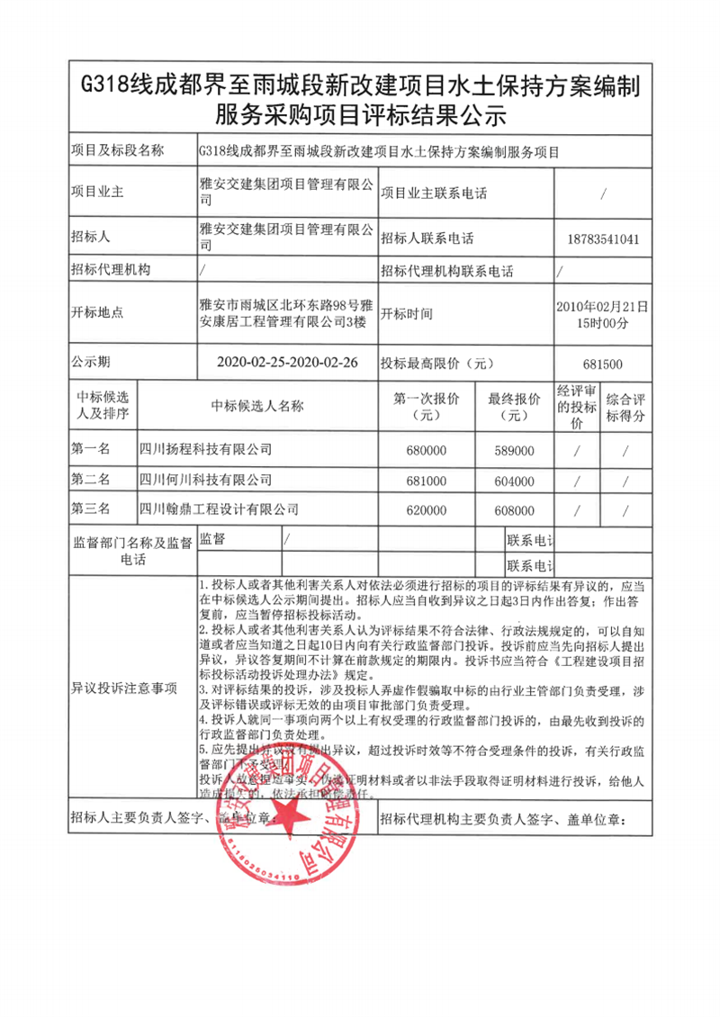 雅安交建集團(tuán)項(xiàng)目管理有限公司G318線成都界至雨城段新改建項(xiàng)目水土保持方案編制服務(wù)采購項(xiàng)目評標(biāo)結(jié)果公示