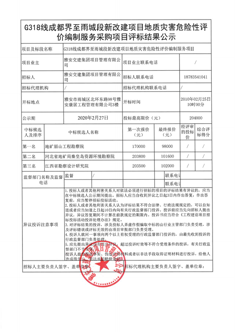 雅安交建集團(tuán)項(xiàng)目管理有限公司G318線(xiàn)成都界至雨城段新改建項(xiàng)目地質(zhì)災(zāi)害危險(xiǎn)性評(píng)價(jià)編制服務(wù)項(xiàng)目評(píng)標(biāo)結(jié)果公示