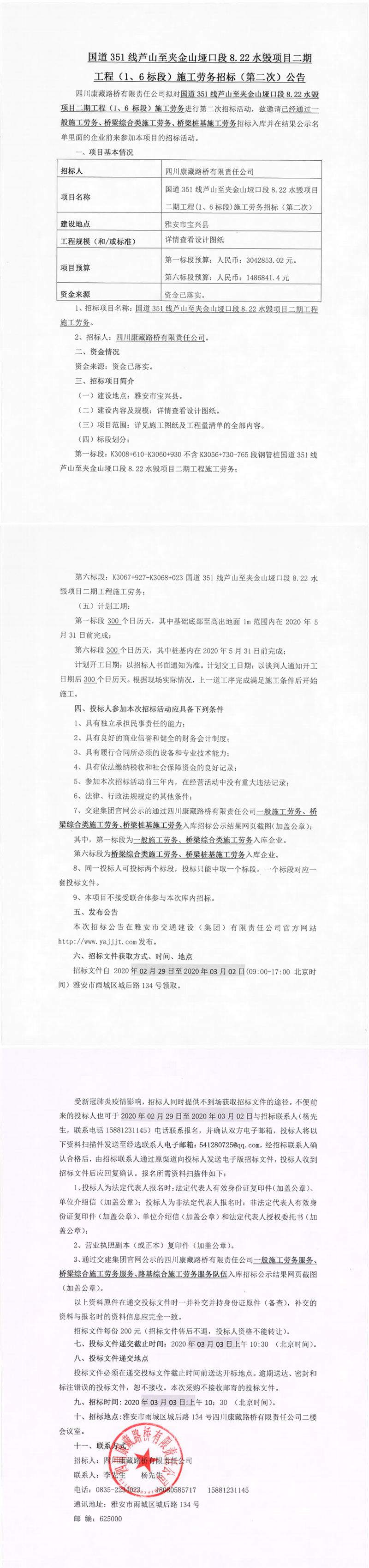四川康藏路橋有限責(zé)任公司國道351線蘆山至夾金山埡口8.22水毀項(xiàng)目二期工程(1、6標(biāo)段)施工勞務(wù)招標(biāo)(第二次)公告