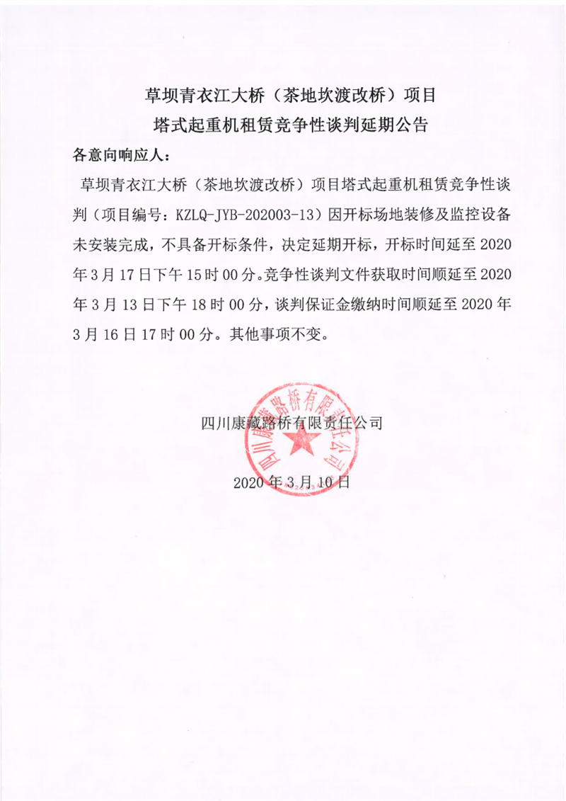 四川康藏路橋有限責(zé)任公司草壩青衣江大橋(茶地坎碼頭渡改橋)項(xiàng)目塔式起重機(jī)租賃競(jìng)爭(zhēng)性談判延期公告