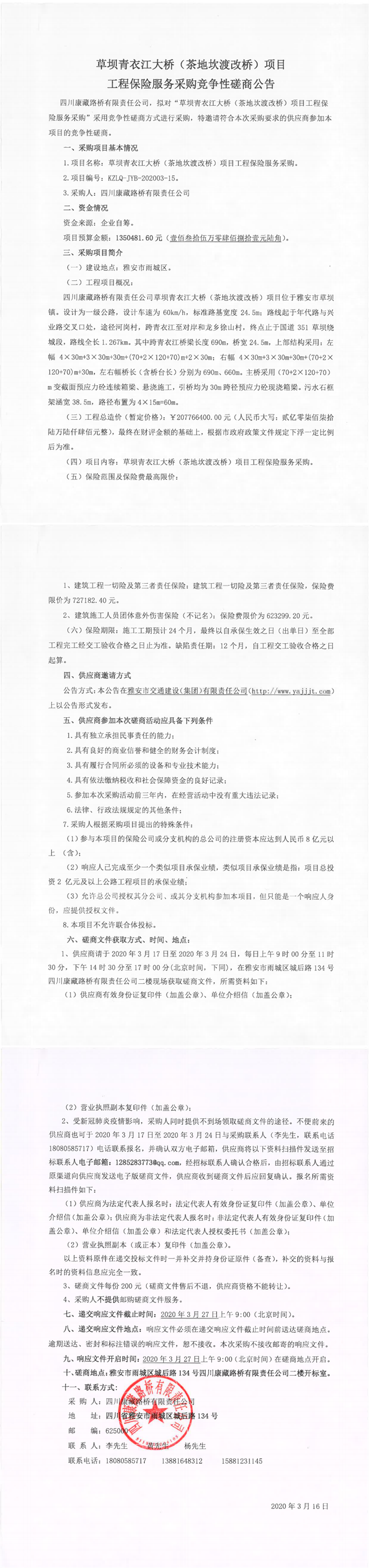 四川康藏路橋有限責(zé)任公司草壩青衣江大橋(茶地坎渡改橋)項(xiàng)目工程保險(xiǎn)服務(wù)采購競(jìng)爭(zhēng)性磋商公告