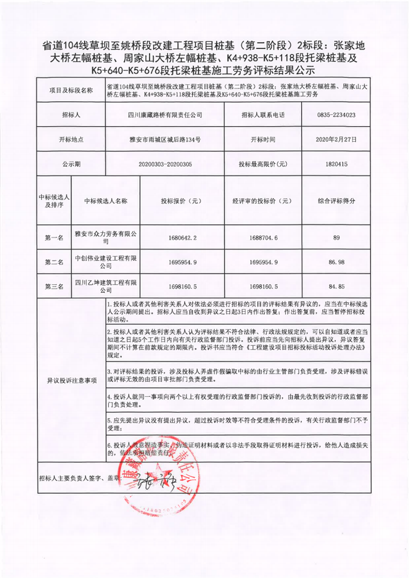 四川康藏路橋有限責任公司省道104線草壩至姚橋段改建工程項目樁基(第二階段)2標段:張家地大橋左幅樁基、周家山大橋左幅樁基、K4+938-K5+118段托梁樁基及K5+640-K5+676段托梁樁基施工勞務評標結(jié)果公示
