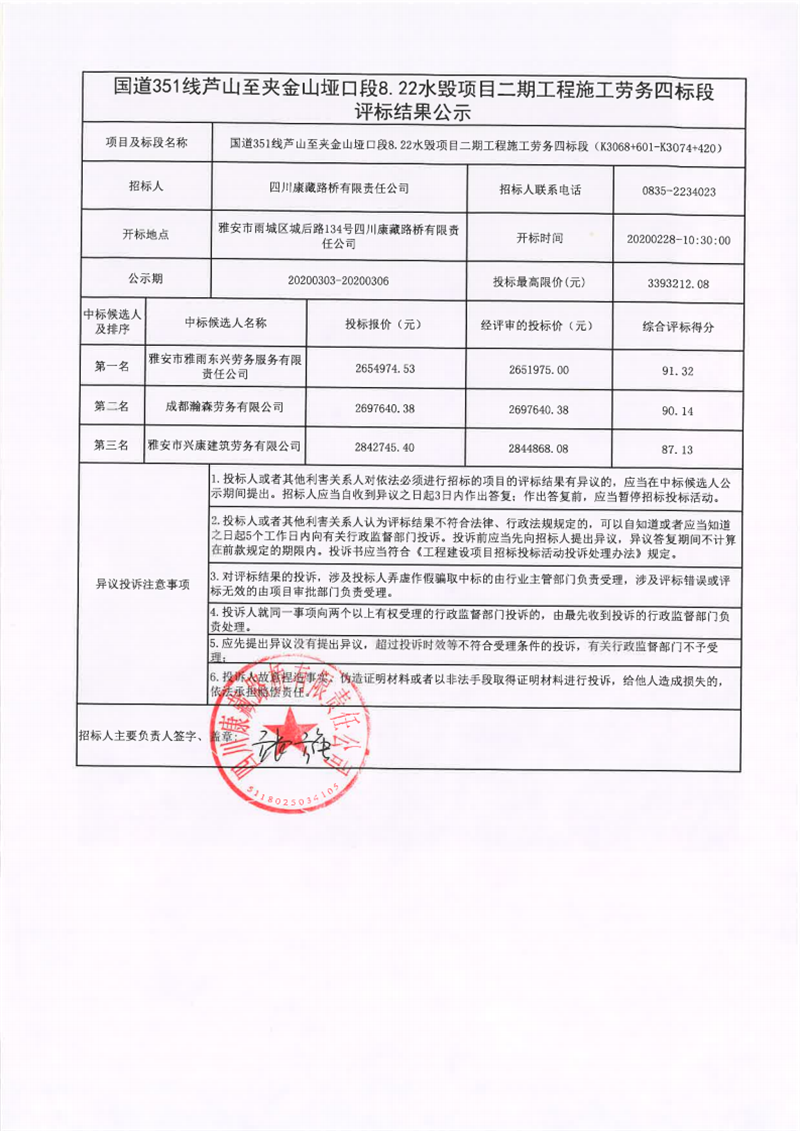 四川康藏路橋有限責(zé)任公司國(guó)道351線蘆山至夾金山埡口段8.22水毀項(xiàng)目二期工程施工勞務(wù)四標(biāo)段評(píng)標(biāo)結(jié)果公示