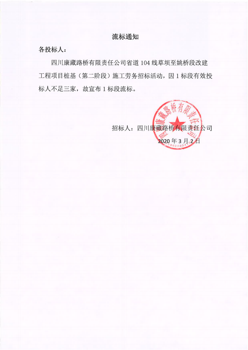 四川康藏路橋有限責任公司省道104線草壩至姚橋段改建工程項目樁基(第二階段)施工勞務流標通知