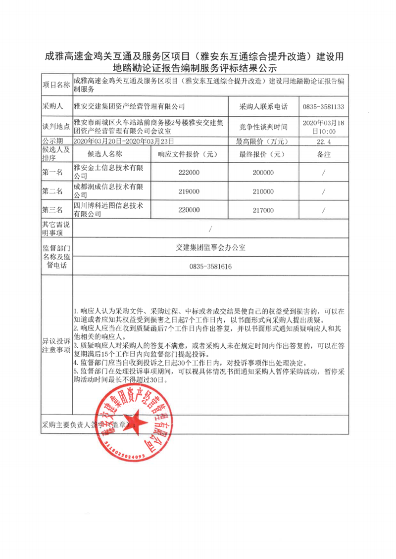 雅安交建集團(tuán)資產(chǎn)經(jīng)營管理有限公司成雅高速金雞關(guān)互通及服務(wù)區(qū)項(xiàng)目(雅安東互通綜合提升改造)建設(shè)用地踏勘論證報(bào)告編制服務(wù)評(píng)標(biāo)結(jié)果公示