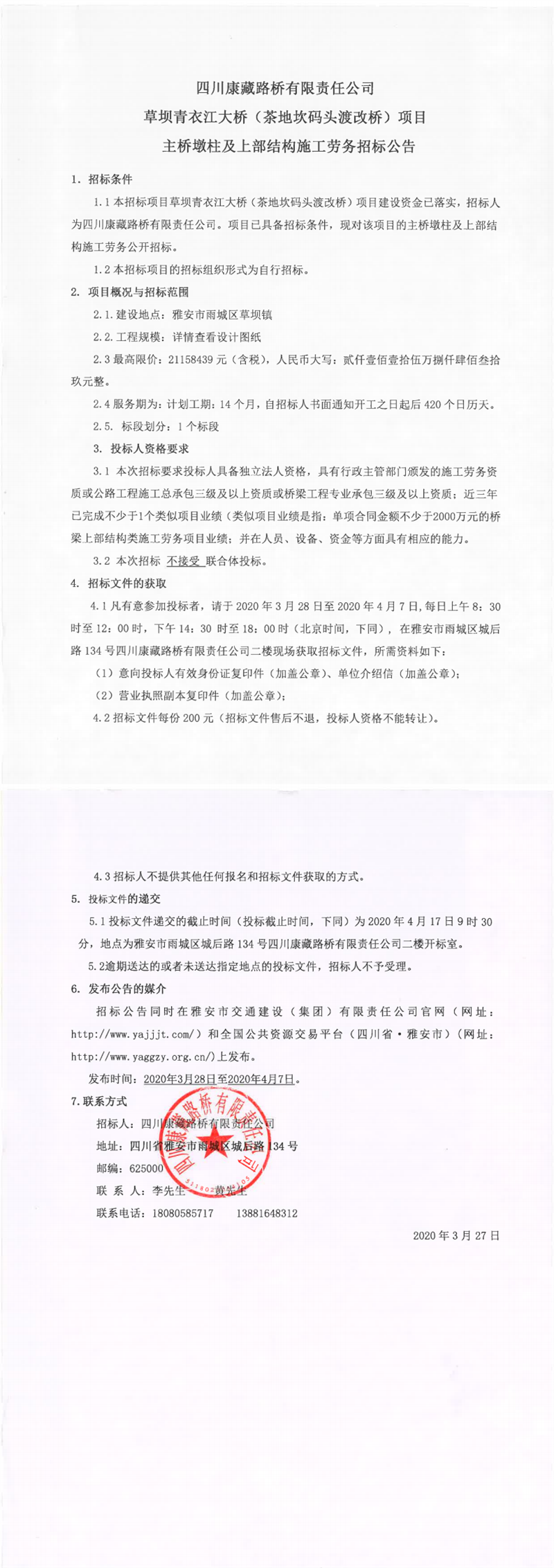 四川康藏路橋有限責(zé)任公司草壩青衣江大橋(茶地坎碼頭渡改橋)項目主橋墩柱及上部結(jié)構(gòu)施工勞務(wù)招標(biāo)公告