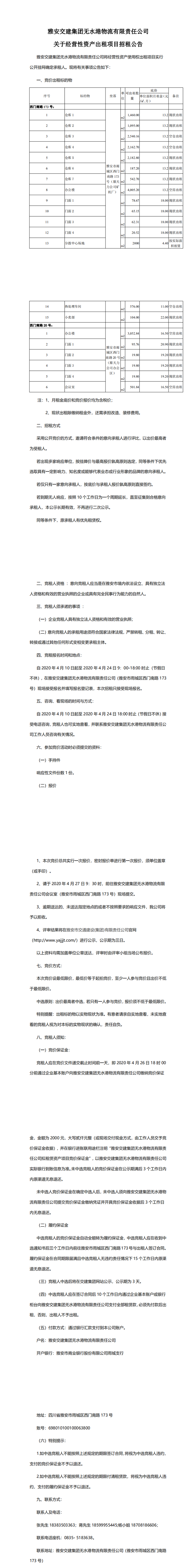 雅安交建集團無水港物流有限責任公司關于經(jīng)營性資產(chǎn)出租項目招租公告