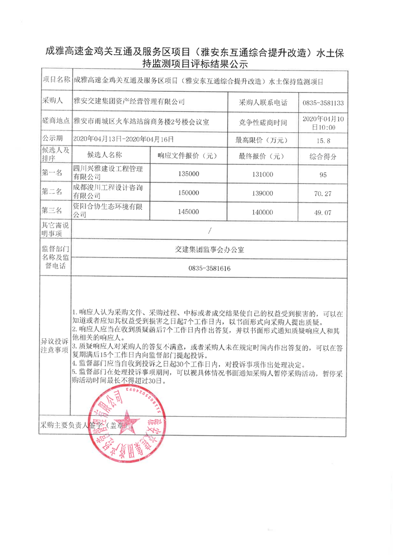雅安交建集團(tuán)資產(chǎn)經(jīng)營管理有限公司成雅高速金雞關(guān)互通及服務(wù)區(qū)項目(雅安東互通綜合提升改造)水土保持監(jiān)測項目評標(biāo)結(jié)果公示