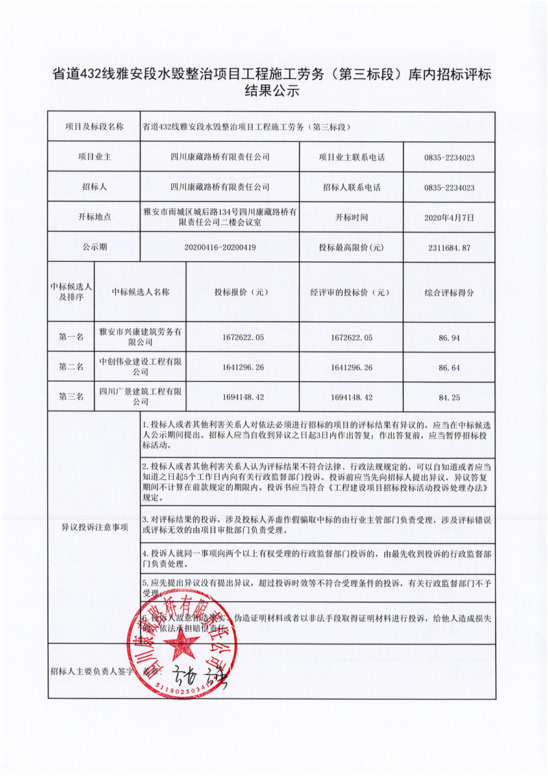 四川康藏路橋有限責(zé)任公司省道432線雅安段水毀整治項(xiàng)目工程施工勞務(wù)(第三標(biāo)段)庫內(nèi)招標(biāo)評標(biāo)結(jié)果公示