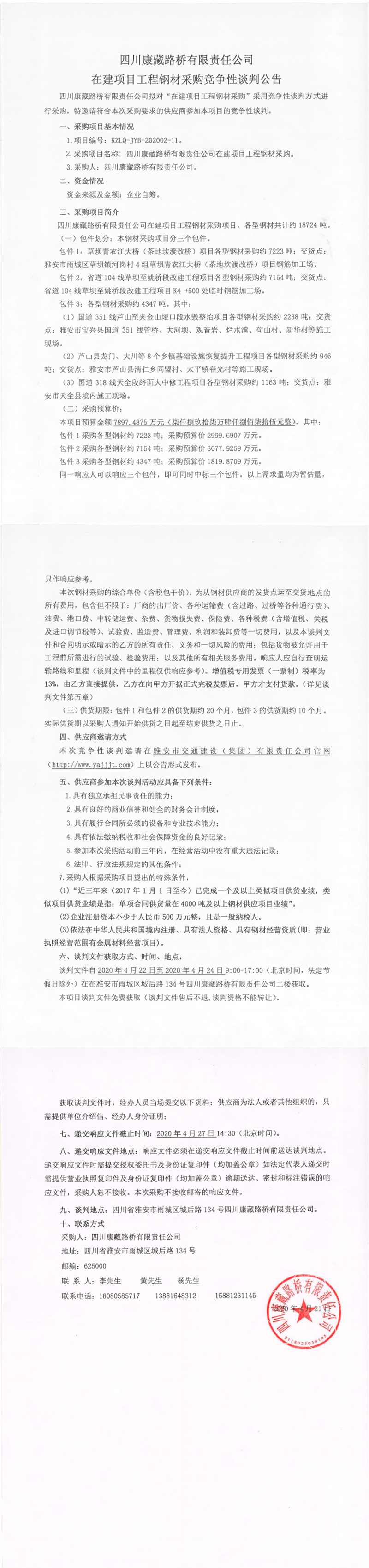 四川康藏路橋有限責(zé)任公司在建項(xiàng)目工程鋼材采購競(jìng)爭(zhēng)性談判公告
