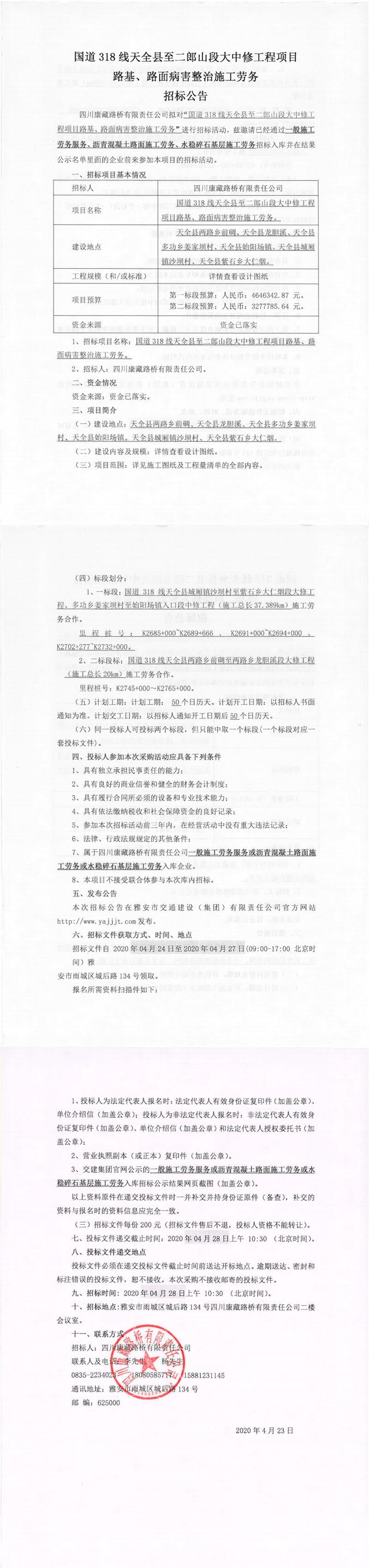 四川康藏路橋有限責(zé)任公司國(guó)道318線天全縣至二郎山段大中修工程項(xiàng)目路基、路面病害整治施工勞務(wù)招標(biāo)公告