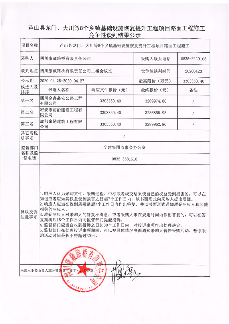四川康藏路橋有限責任公司蘆山縣龍門、大川等8個鄉(xiāng)鎮(zhèn)基礎(chǔ)設(shè)施恢復提升工程項目路面工程施工競爭性談判結(jié)果公示