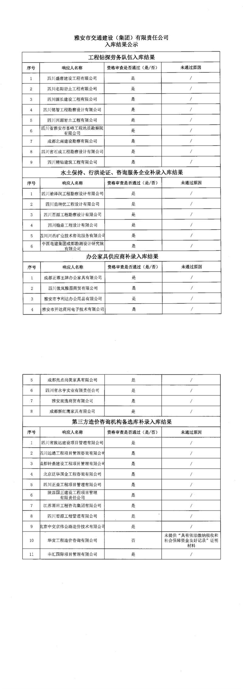 雅安市交通建設(shè)(集團(tuán))有限責(zé)任公司入庫(kù)結(jié)果公示
