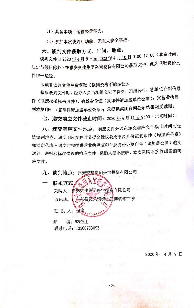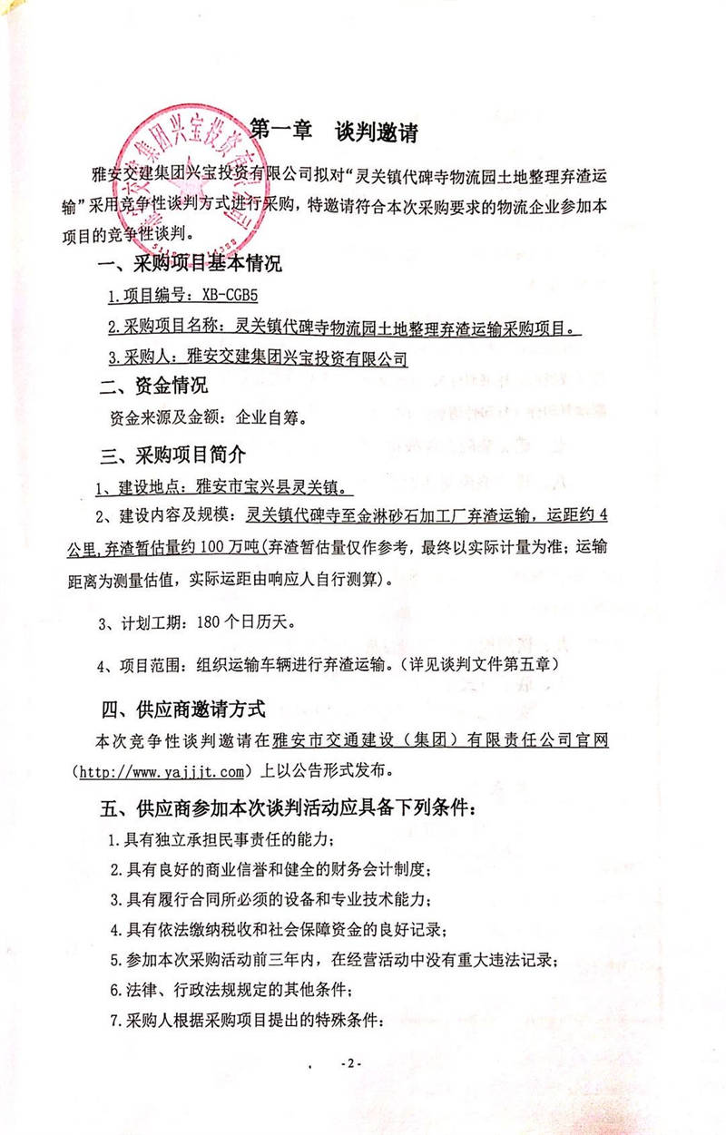 雅安交建集團(tuán)興寶投資有限公司靈關(guān)鎮(zhèn)代碑寺物流園土地整理?xiàng)壴\(yùn)輸采購(gòu)項(xiàng)目競(jìng)爭(zhēng)性談判公告