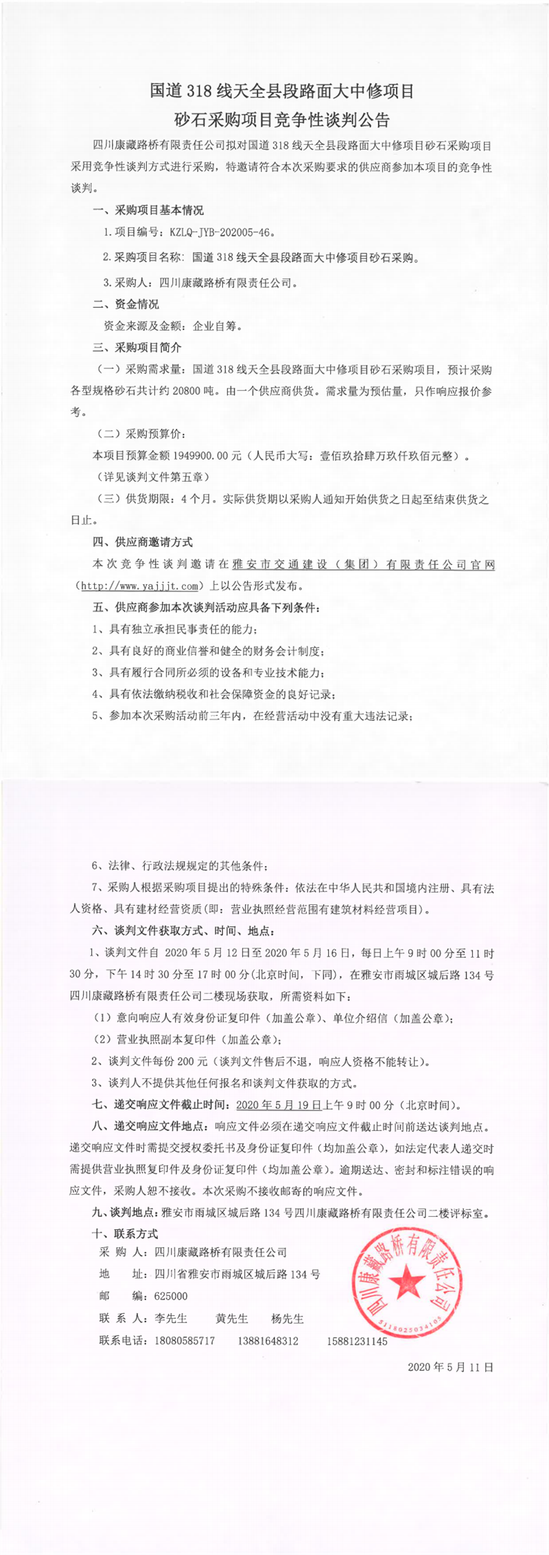 四川康藏路橋有限責(zé)任公司國(guó)道318線天全縣段路面大中修項(xiàng)目砂石采購(gòu)項(xiàng)目競(jìng)爭(zhēng)性談判公告