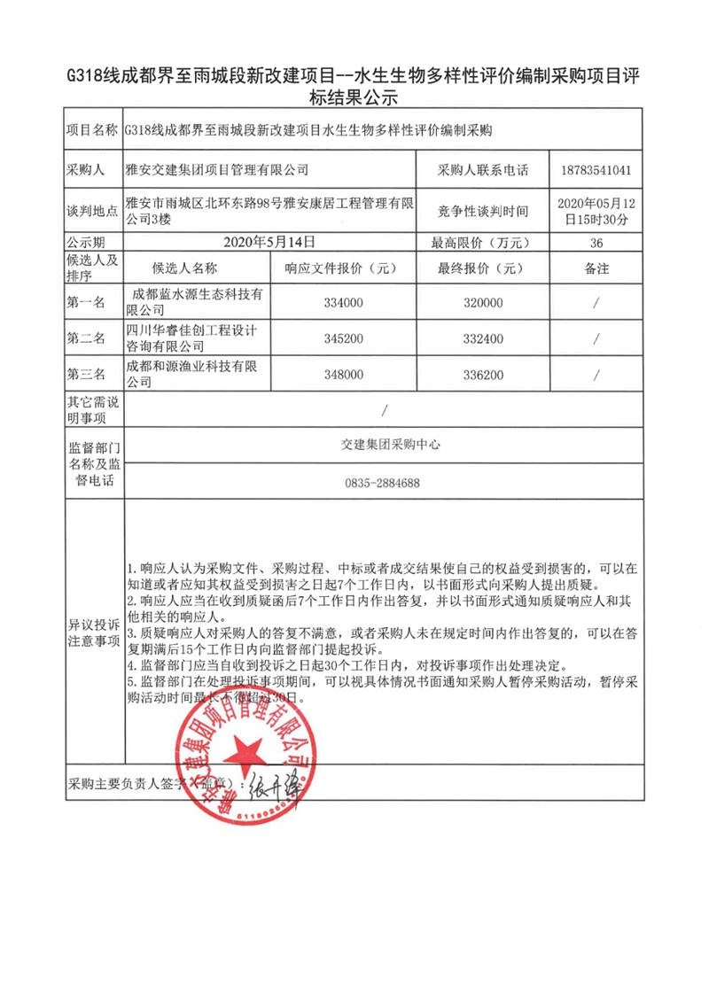 雅安交建集團(tuán)項(xiàng)目管理有限公司G318線成都界至雨城段新改建項(xiàng)目水生生物多樣性評(píng)價(jià)編制采購項(xiàng)目評(píng)標(biāo)結(jié)果公示