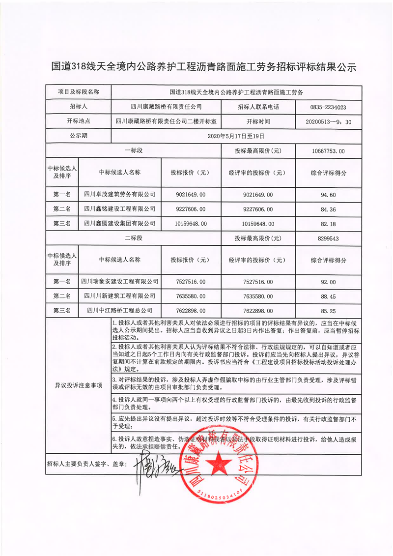 四川康藏路橋有限責(zé)任公司國(guó)道318線天全境內(nèi)公路養(yǎng)護(hù)工程瀝青路面施工勞務(wù)招標(biāo)評(píng)標(biāo)結(jié)果公示